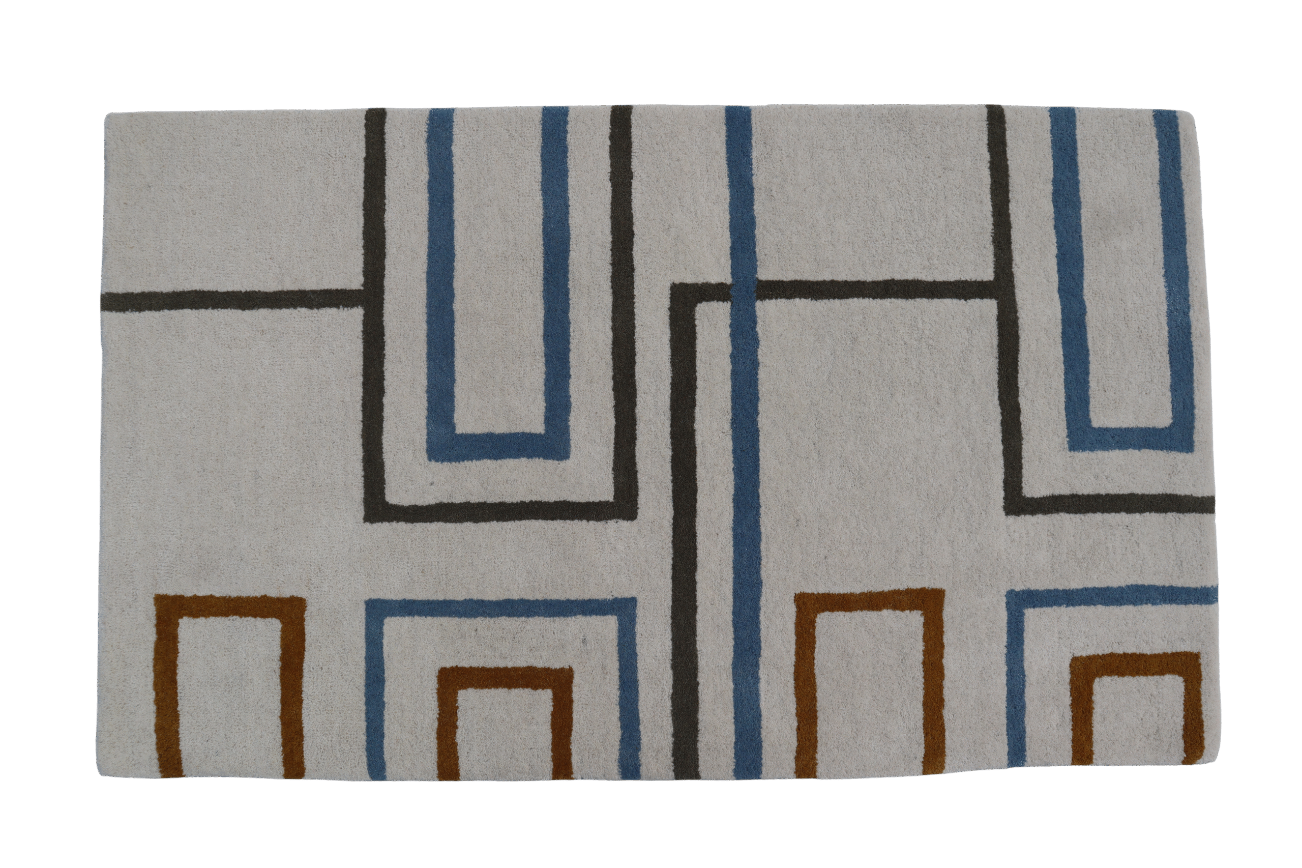 - DESIGN PATTERN: Modern geometric pattern featuring blue, grey, and orange lines creating a contemporary maze-like design on a white background